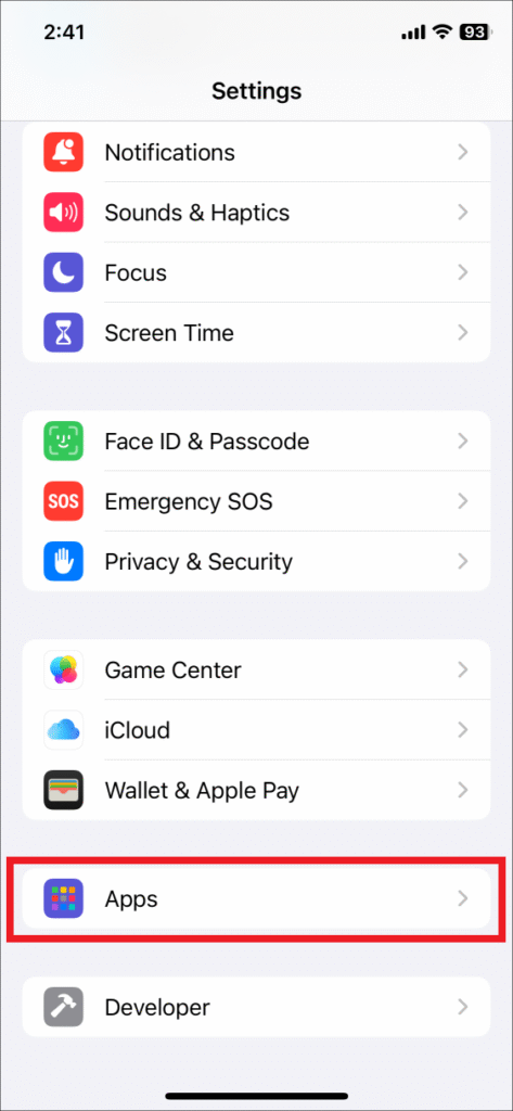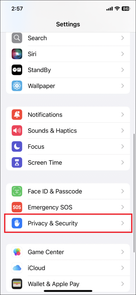 1. From the main “Settings” screen, tap “Privacy & Security”.