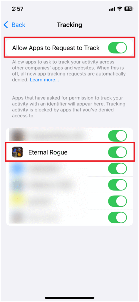 3. If the toggle for “Allow Tracking” is OFF (gray), tap it to turn it ON (green).